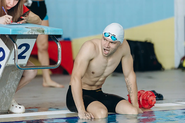 Спортсмен сборной Курской области быстрее других проплыл 300 метров в бассейне, преодолел 8 километров на велостанке и пробежал 2 км.