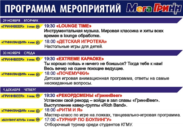 ПОЛНАЯ ПРОГРАММА МЕРОПРИЯТИЙ, АКЦИЙ И КОНЦЕРТОВ В МегаГРИННе