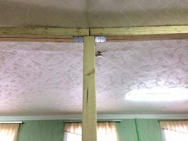 Выполнены они из толстого бруса. Проблема в том, что строители использовали непросушенное дерево низкого качества. Высыхая, брус деформируется и покрывается трещинами. Повреждения видны невооруженным глазом: широкие трещины присутствуют и на потолочных балках и на тех, которые установлены вертикально.