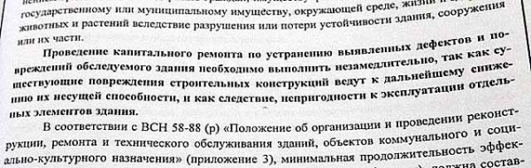 В целом техническое состояние здания оценили как «ограниченно-работоспособное», отметив при этом, что в аварийном состоянии находятся бетонный балкон и одна из чердачных балок. Балкон посоветовали оградить, а в месте прогиба балки усилить чердачное перекрытие «путем устройства разгружающих рам».