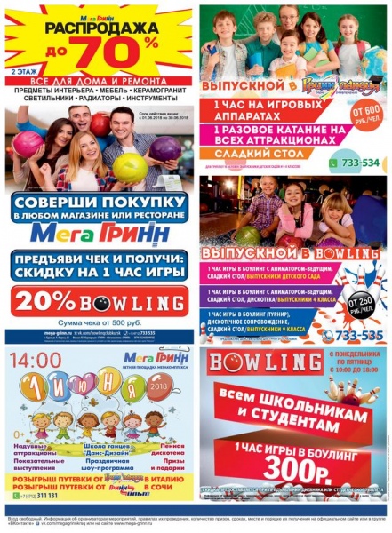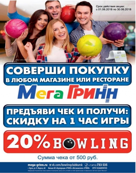 Соверши покупку в любом магазине или ресторане «МегаГРИНН», предъяви чек и получи: скидку на 1 час игры -20% в БОУЛИНГ!