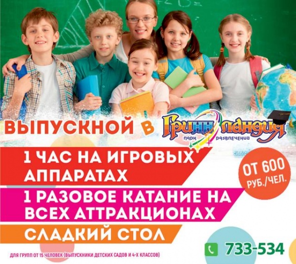 ВЫПУСКНОЙ в «ГРИННЛАНДИИ» — 1 час на игровых аппаратах, 1-разовое катание на всех аттракционах, сладкий стол — от 600 руб./чел.