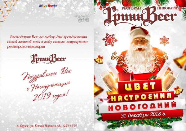 «ГРИНН BEER» — ресторан с традициями. Его кухня хорошо известна курянам. И Новый год — это отличный повод побаловать себя любимыми блюдами и открыть что-то новое. В новогоднем меню мясное и рыбное ассорти с красной икрой, вкусные салаты, сочный стейк и самая знаменитая закуска ресторана, за которой возвращаются снова и снова — крылья «Баффало» с соусом «Блю-Чиз».