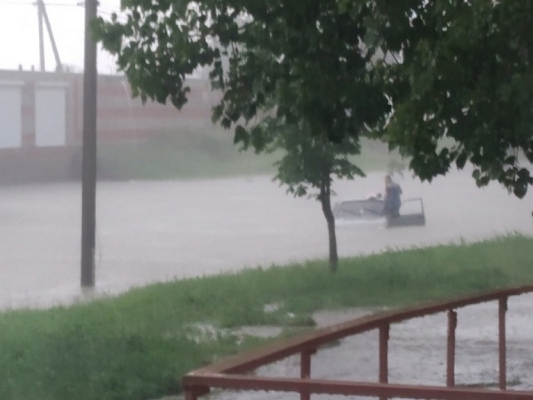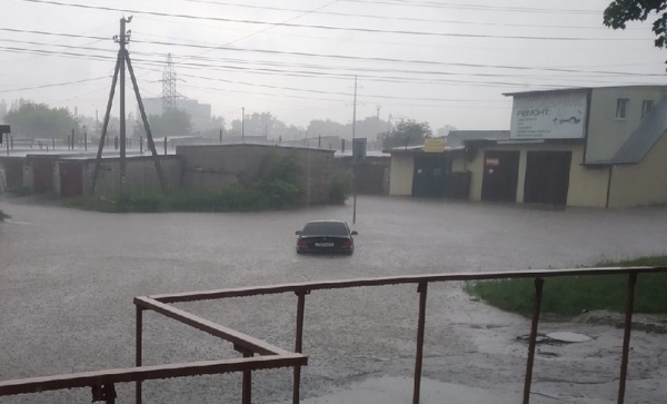 Зато на Железнодорожный округ стихия обрушилась с новой силой. Потоки дождевой воды превратили дороги в бурные реки. На улице Республиканской утонули два легковых автомобиля. Одну из машин залило почти по окна. У второй капот практически целиком скрыт под водой.
