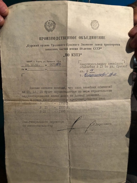 Двухэтажное здание было построено в 1956 году. Возводили его из шлакоблоков, как временное жилье для рабочих, поэтому об удобстве для жильцов или надежности материалов особенно не пеклись. В итоге дом был признан аварийным еще в 1986 году. Пенсионерка Нина Калашникова показывает пожелтевший от времени листок — письмо завода КЗТЗ, в котором говорится, что здание общежитие должны расселить и снести и в 1993-м. Соседний, одиннадцатый дом, действительно снесли. А до их общежития очередь так и не дошла. Перестройка «обнулила» все обещания.