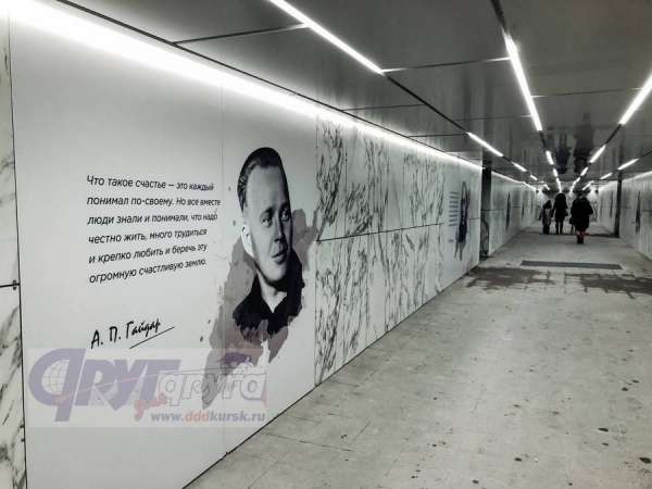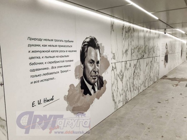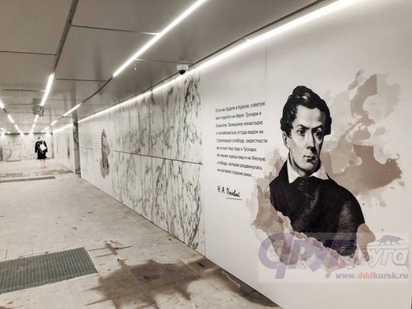 Стены нового перехода отделаны керамогранитом. Среди плитки разместили большие панно с портретами и цитатами известных писателей, родившихся или когда-то живших в Курске.