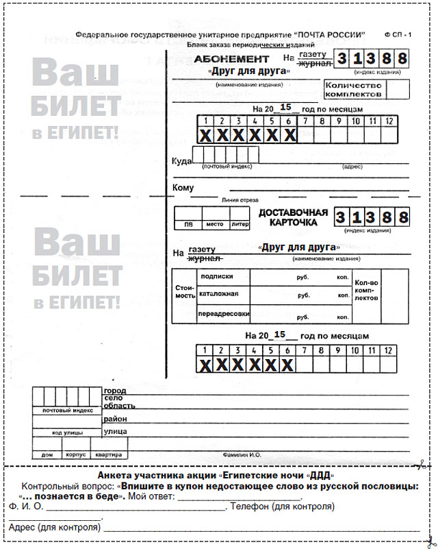 2. Сделайте ксерокопию оплаченной квитанции и ответьте на контрольный вопрос, вписав ключевое слово в купон. Вырезав купон, вместе с копией оплаченной квитанции до 15 января 2015 года принесите или пришлите его в редакцию «ДДД» по адресу: 305004, Курск, ул. Радищева, 60/15, газета «Друг для друга» (остановка «Ул. Садовая»).