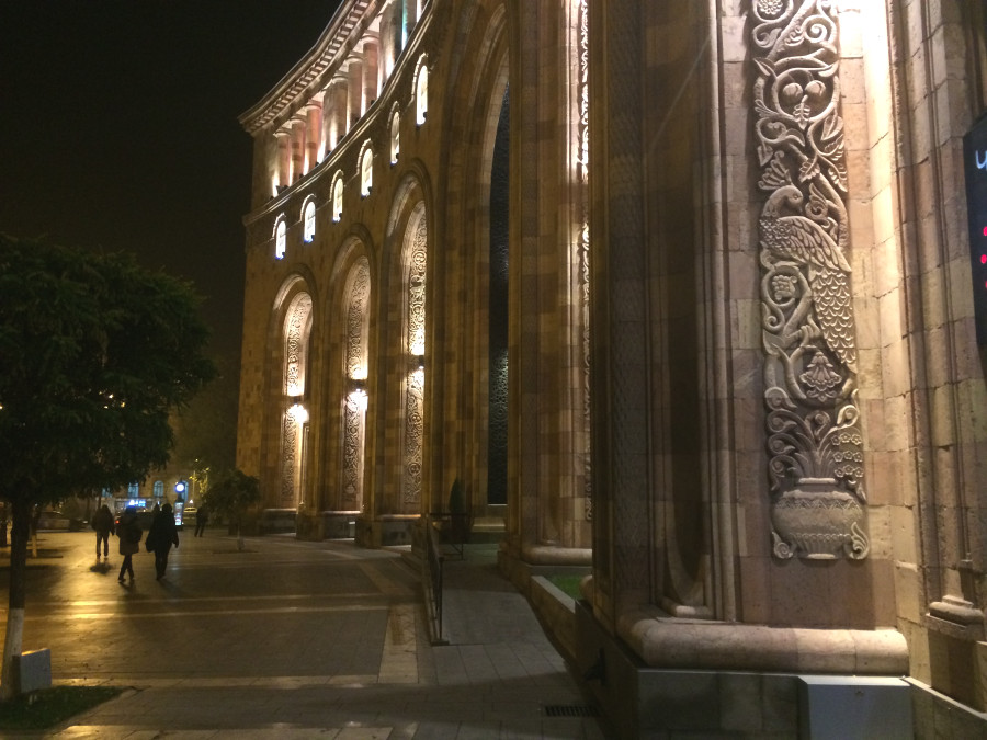 Сердце Еревана – площадь Республики – до 1991 года носила имя Ленина. Ее овальную форму образуют пять зданий: национальный исторический музей, правительство Армении, центральное здание почты, шикарная гостиница, министерство иностранных дел и энергетики. Всё построено из белого и розового туфа, нижние части – из базальта. Фасады зданий украшены древнеармянской орнаментальной резьбой. При ночной иллюминации, а на подсветку величественных сооружений денег здесь не жалеют, площадь Республики выглядит грандиозно. Впрочем, как и днем. Тем, кто посетит Ереван с конца мая по сентябрь, повезет еще больше. В это время в центре города работают поющие фонтаны – незабываемое сочетание танца воды, света и музыки.