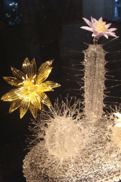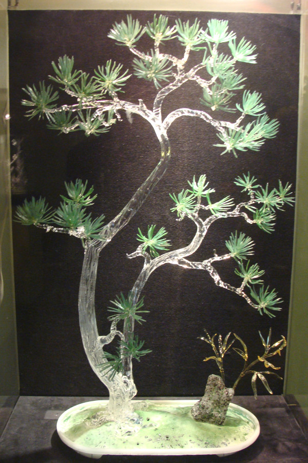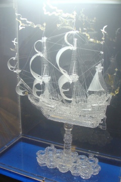Уже 40 лет московский художник работает с нетрадиционным кварцевым стеклом, которое делают из горного хрусталя. При температуре до 2000 градусов хрупкий материал превращается в корабли и цветы, бабочек и стрекоз, животных и сказочных персонажей. Мерцающие, многоцветные композиции не имеют аналогов в мире. «Это долгий процесс, – пояснил «ДДД» мастер. – Сначала делается эскиз. Шары я выдуваю, остальное лепится на огне. Потом из множества деталей скульптура собирается целиком». Чтобы получить изящные статуэтки и искусные подсвечники, стеклодув трудится над каждым экспонатом от пары месяцев до нескольких лет.