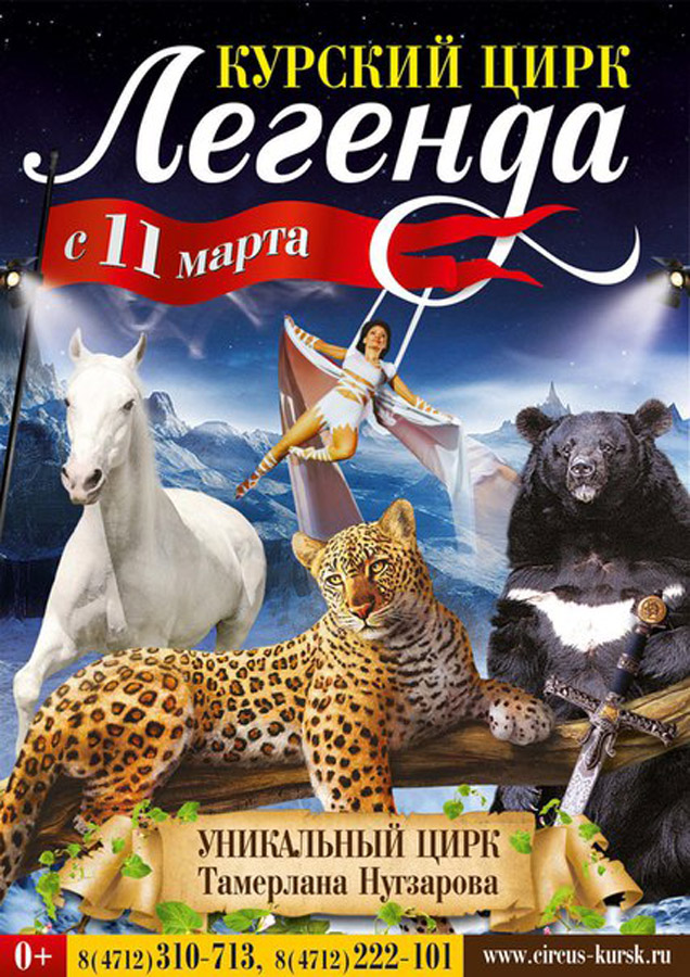 11 марта в курском цирке стартовала новая программа «Легенда» труппы Народного артиста России Тамерлана Нугзарова, обладателя Государственной премии РФ. Это уникальные номера с участием лошадей, медведей, леопарда, дрессированных собак...