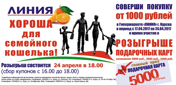 Каждую неделю покупатели могут принять участие в розыгрыше подарочных карт номиналом 5000, 3000 рублей и нескольких сертификатов по 1000 рублей. Для этого необходимо совершить покупку в гипермаркетах «ЛИНИЯ» города Курска или Курчатова на сумму от 1000 рублей. Розыгрыш призов будет проходить каждый понедельник на территории гипермаркетов «ЛИНИЯ».