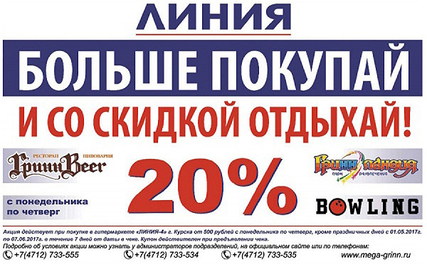 В тему: «ЛИНИЯ» хороша для семейного кошелька! Лето СКИДОК в гипермаркетах «ЛИНИЯ»! АКЦИЯ!