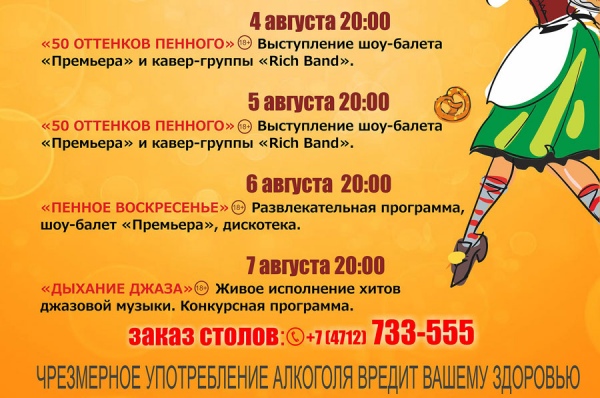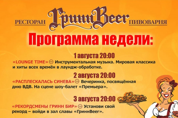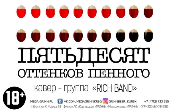 Мы приготовили для вас незабываемую шоу-программу, множество литров пенного, каждому вошедшему комплимент от ресторана, а так же выступление кавер-групы «Rich Band».