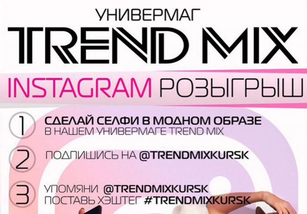 Для участия необходимо сделать фото или селфи в модном луке, который вы присмотрели или уже купили в нашем универмаге TREND MIX, в описании не забудьте упомянуть нас @trendmixkursk и поставить хэштег #trendmixkursk ну и конечно нужно быть подписанным на @trendmixkursk Начинать можно уже сегодня!!! Мы будем знакомить вас с призами и партнерами более подробно. Следите за новостями! Не стесняйтесь, оригинальничайте, отмечайте друзей, экспериментируйте и выигрывайте!!! Результаты будут оглашены и торжественно вручены 5 августа. Участвуйте, победителей будет много!!!