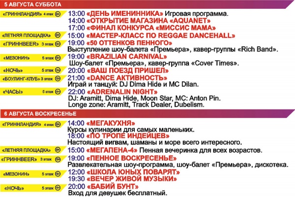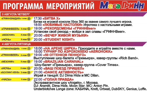 ПОЛНАЯ ПРОГРАММА МЕРОПРИЯТИЙ, АКЦИЙ И КОНЦЕРТОВ В «МегаГРИННе»