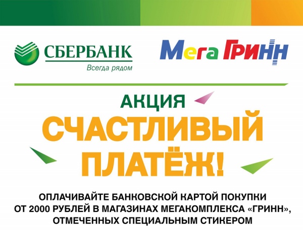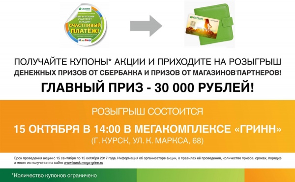 С 15.09.2017 г. по 15.10.2017 г. посетители, совершают одну или несколько покупок в Местах продаж в безналичной форме с использованием банковской карты СБЕРБАНКА на терминалах Мест продаж на сумму не менее 2 000 (две тысячи) рублей 00 копеек, получают купоны участников акции. Купон дает возможность участвовать в розыгрыше призов 15.10.2017г. (при наличии чека подтверждающего покупку в данный период на сумму не менее 2 000 руб). Главные Призы для участников акции предоставляет спонсор акции ПАО «Сбербанк России». Розыгрыш состоится 15 октября в 14:00 в МЕГАКОМПЛЕКСЕ «ГРИНН».