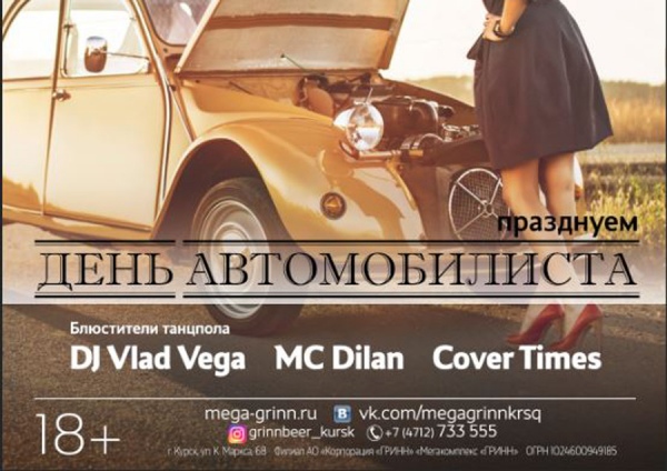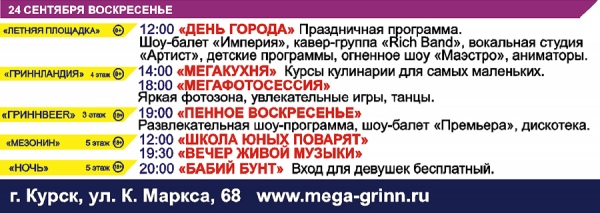 Курск. «МегаГРИНН» приглашает весело отметить День ГОРОДА и День АВТОМОБИЛИСТА!!! Программа мероприятий и КОНЦЕРТОВ!