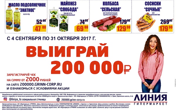 Совершите покупку на сумму от 2 000 рублей c 4.09.2017 г. по 31.10.2017 г. в Гипермаркетах «ЛИНИЯ», зарегистрируйте чек на сайте www.200000.grinn-corp.ru и ВЫИГРАЙТЕ 200 000 рублей!