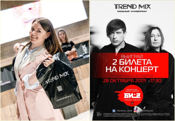 При покупке на сумму от 3500 р. в универмаге TREND MIX вы становитесь участником розыгрыша двух билетов на концерт легендарной группы Би-2.