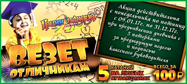 Если ты ОТЛИЧНИК, приходи в наш парк развлечений в любой БУДНИЙ день и захвати с собой ДНЕВНИК с пятью пятерками за прошлую неделю и подписью классного руководители и получай ПЯТЬ КАТАНИЙ на любых аттракционах всего за 100 рублей!!!