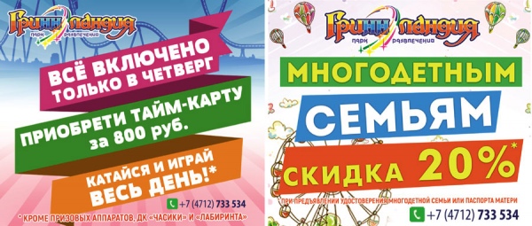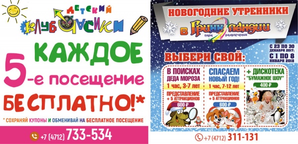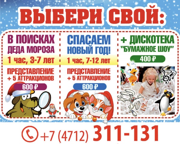 С 1 по 8 января ежедневно юных посетителей и их родителей ждут интересные праздничные программы от парка развлечений «ГРИННЛАНДИЯ». Начало в 13, 15, 17 и 19 часов!