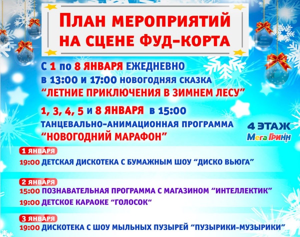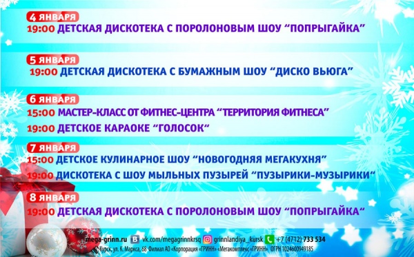 Многофункциональный комплекс «МегаГРИНН» на улице Карла Маркса, 68, приглашает жителей и гостей Курской области на бесплатные праздничные мероприятия, которые продлятся в течение всех новогодних и рождественских каникул.