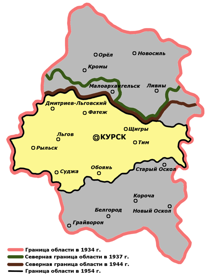 В 1937 году в связи с разделением Западной и Курской областей на Смоленскую, Орловскую и Курскую из состава Курской области отошли к Орловской 25 районов и 5 городов, включая Орел, а затем уже в военное время после Курской битвы еще три района.