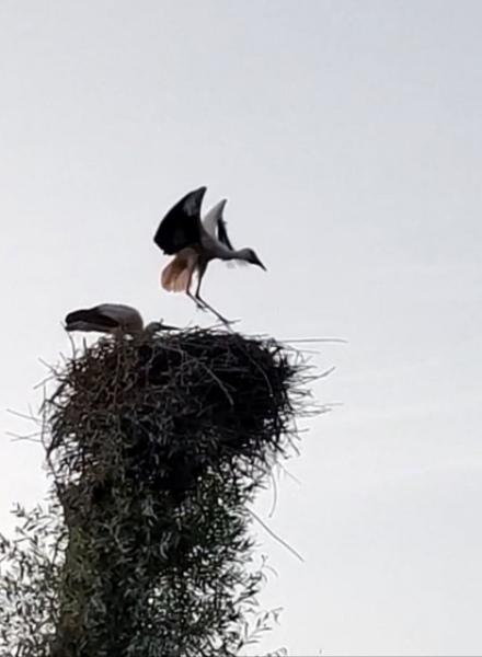 К счастью, аисты не оставили попыток. Через несколько дней принялись вить гнездо на раскидистом дереве, вершину которого срезали электрики, поскольку ветви цеплялись за провода. Получилась удобная площадка: в развилке веток уместилось гнездо, а рядом – «пенек» спиленного ствола, на котором отдыхают птицы.