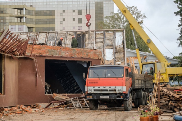 На площадке, которую обнесли высоким забором, работала тяжелая техника. Кирпичные стены сносил экскаватор. Для того чтобы разобрать «пирамиду», привезли кран. Демонтаж не потребовал вложения бюджетных средств, расходы взяла на себя частная строительная компания.