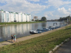 Спускаемся вниз к реке. С берега открывается блестящий вид на центр Орла. Здесь же работает городской пляж. Жаль, что не захватили купальники! Стенд возле спасательной станции информирует: «Температура воздуха – плюс 30, температура воды – плюс 28». Искупаться в Оке не получилось, но есть возможность полюбоваться окрестностями с воды, взяв напрокат водный велосипед или катамаран.